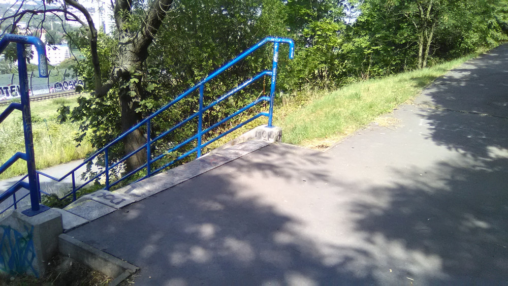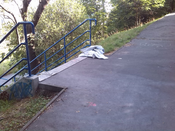 Špinavá deka blízko schodiště. V příkopu u cyklostezky se nachází více odpadků.