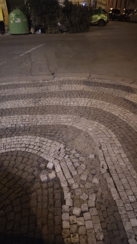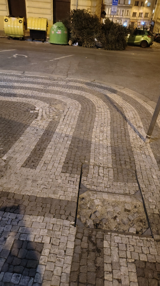 díry v chodníku - vytrhaná dlažba, volné kostky .