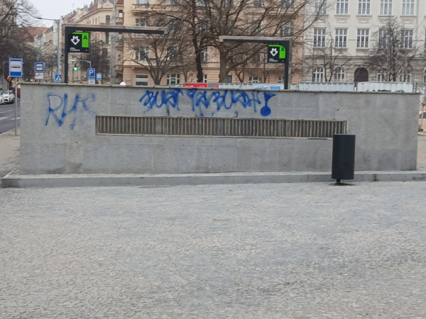Náměstí Jiřího z Poděbrad: Posprejovaná část vstupu do metra (stanice J. z Poděbrad), v souvislosti se stále probíhající rekonstrukcí náměstí obehnaného plechovou zástěnou, která je posprejovávána, někdo (cca 2-3 týdny zpět) posprejoval i vstup do metra. Prosím, jestli lze odstranit nebo předat k vyřízení Dopravnímu podniku hl. m. Prahy. Děkuji.