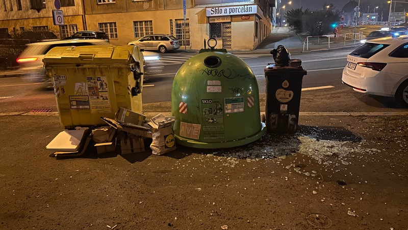Chybí kontejner na papír. Rozsypané sklo kolem kontejneru.