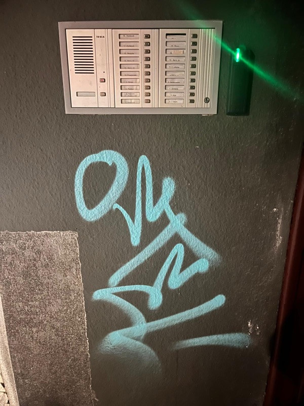 Graffity na domě u vchodu, hlášeno 16.11.2025 stále neodstraněno!