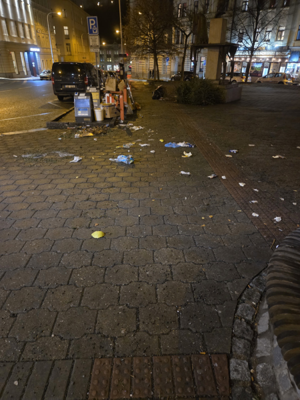 děkujeme za Váš podnět. Tato plocha by měla být pravidelně uklízena pracovníky Pražských služeb, kteří by v rámci pravidelného úklidu měli vše odstranit. Následně sami provedeme kontrolu, zda se tak skutečně stalo a případně místo poklidíme.