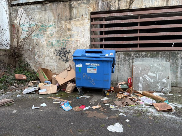 Je zde obrovský nepořádek kolem popelnic na papír a plast.