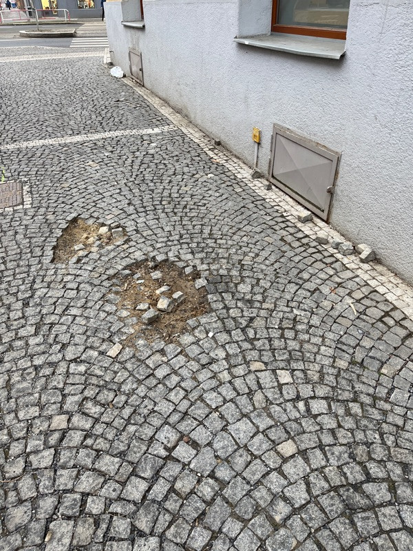 Rozbitý chodník kostky poházené po okolí.