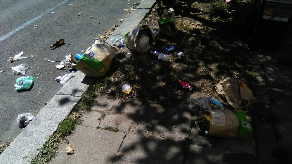 Spousta rozsypaných odpadků v zeleni a na ulici.