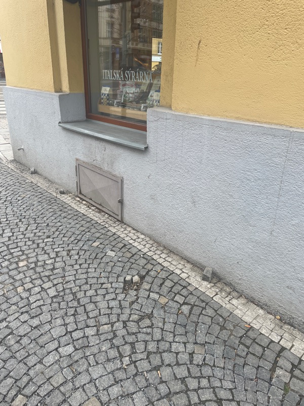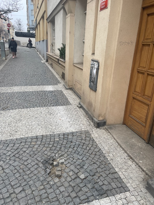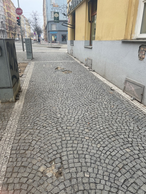 Na 20 metrech 4-5 casti rozpadajiciho chodniku, U formagerie