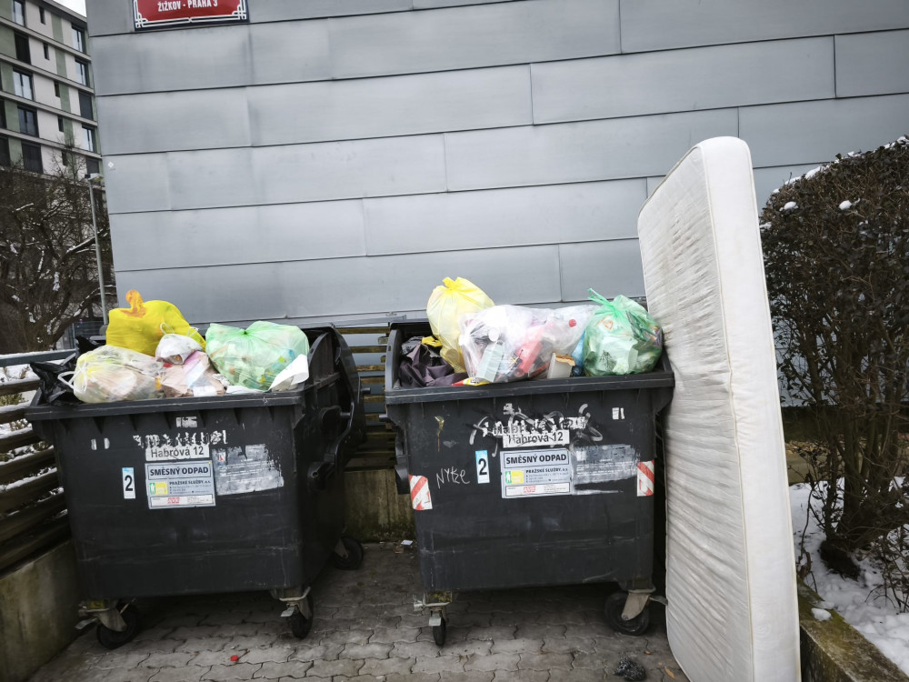 Madrace v prostoru u popelnic.