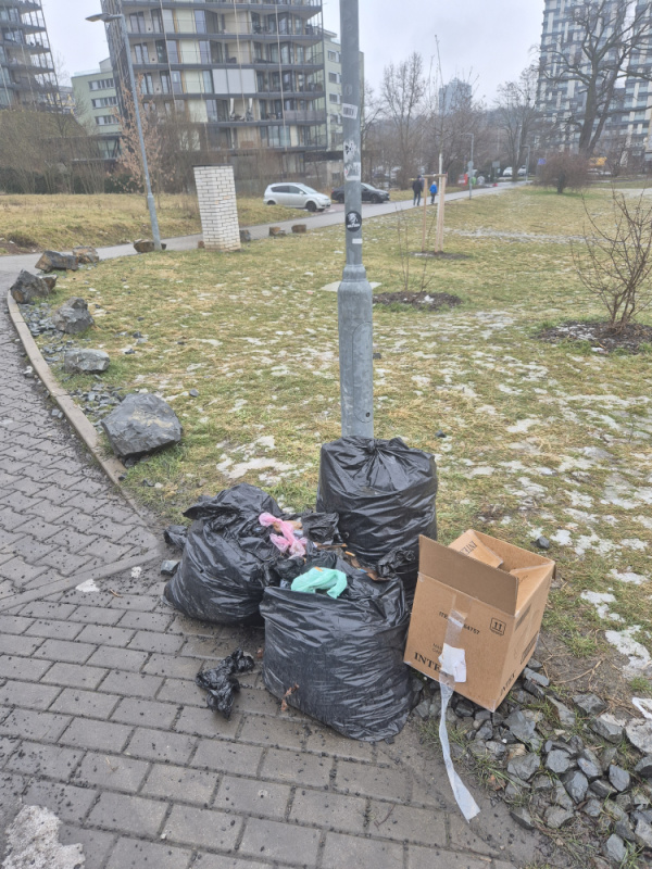 Hromadění odpadu na okraji parku podél ulice Pitterova směrem k Lesní školce u Sportovního centra SK Žižkov