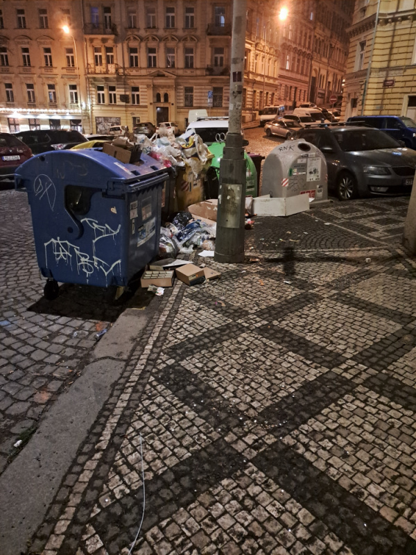 děkujeme za Váš podnět. Úklid jednotlivých stanovišť kontejnerů na tříděný odpad probíhá pravidelně podle stanoveného harmonogramu (od 6:00 do do 22:00 každý den včetně sobot a nedělí). Provedeme kontrolu a případně předáme podnět společnosti AVE CZ, která kontejnery na tříděný odpad vyváží a za pořádek kolem nich odpovídá.