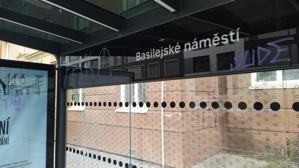 Posprejovaná zastávka autobusu Basilejské náměstí v ulici Malešická 2406/31.