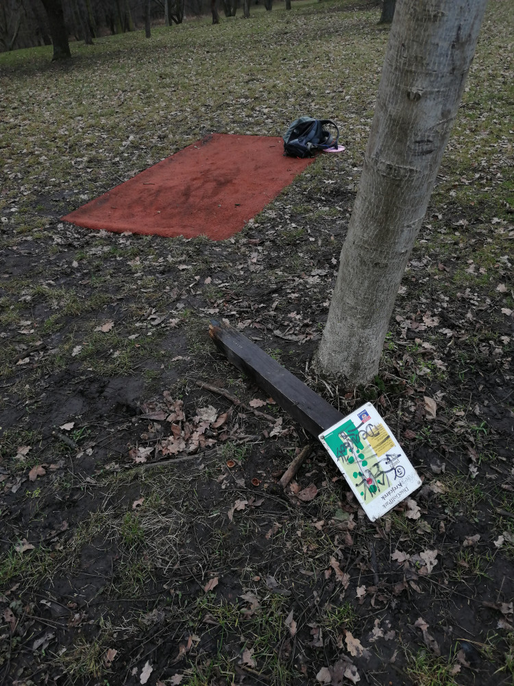 Uhnilý sloupek na discgolfovém hřišti na Krejcárku, výhoziště č. 5.
