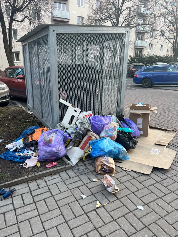 Odpadky pohozené vedle klece na popelnice se směsným odpadem.