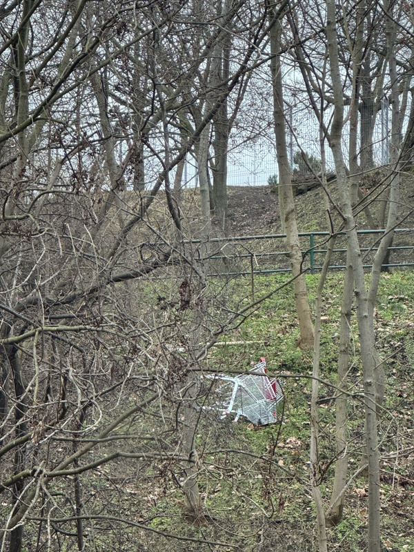 Pod cestu z Jeseniovy na Parukářku se zatoulal košík z Billy. Děkujeme Za úklid. Kousek za (asi) trafostanicí cca pod dětským hřištěm.