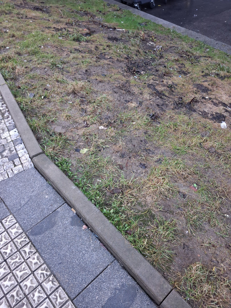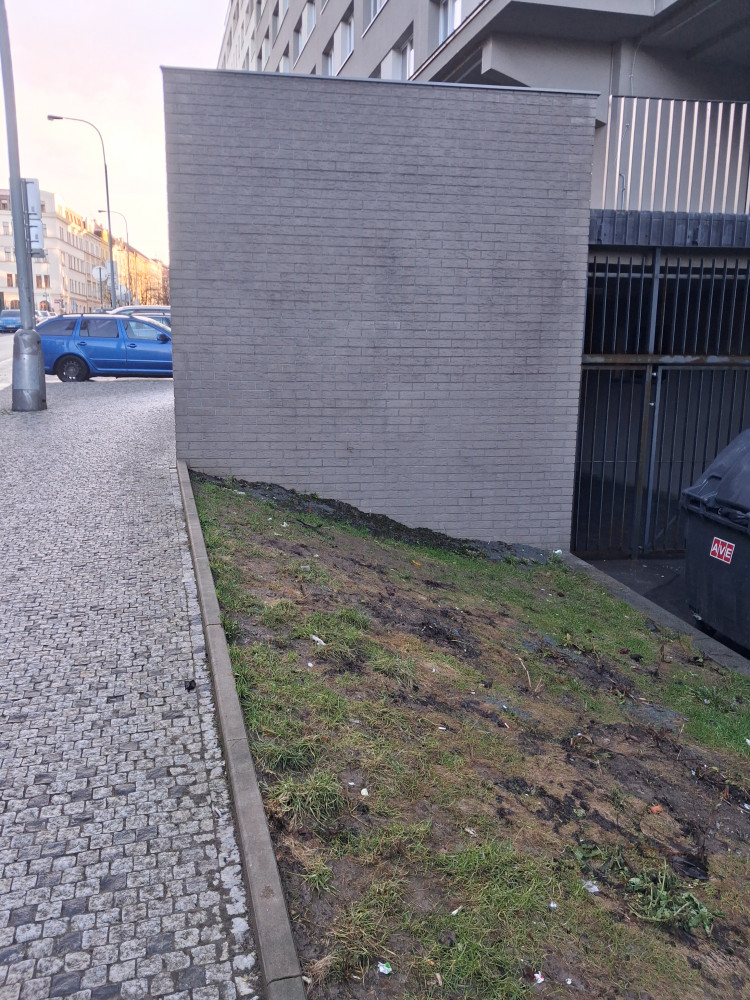 Odpadky na chodníku a trávníku Roháčova 42