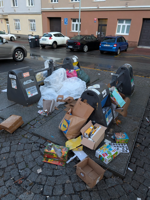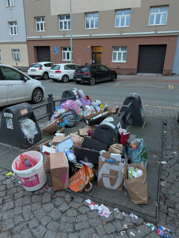 Rád bych zdůraznil, že v pátek proběhl svoz a místo bylo kompletně uklizeno. Přesto se zde během pouhého víkendu (jak dokazuje fotografie z pondělí 23. 2.) vytvořila obrovská hromada odpadu. Kontejnery se okamžitě zaplní a lidé následně nemají odpad kam dávat, což nevyhnutelně vede ke vzniku černé skládky plné kartonů, plastů a směsného odpadu přímo na chodníku a v parkovací zóně.