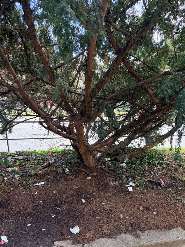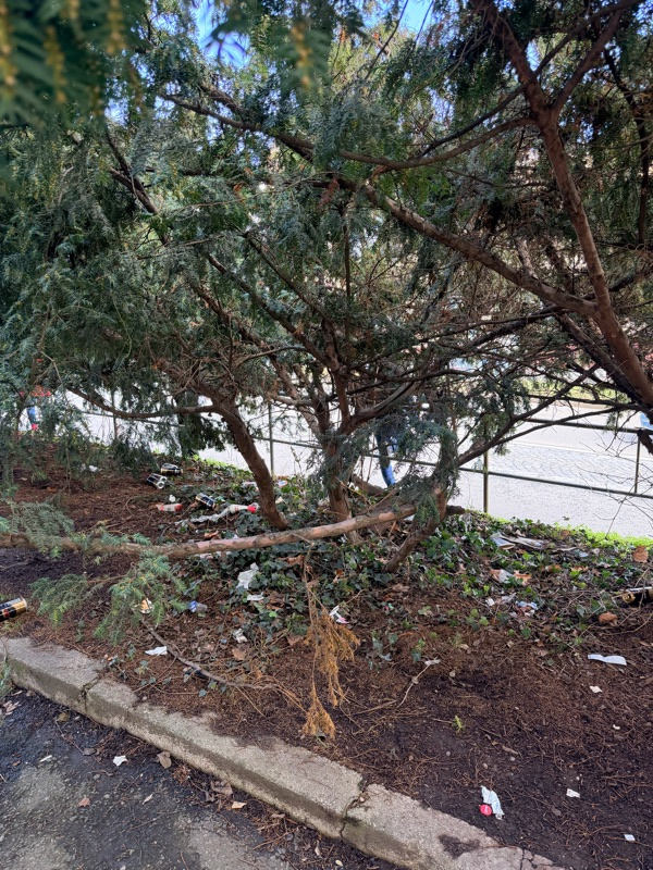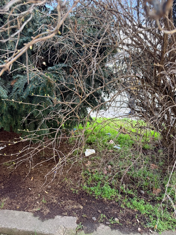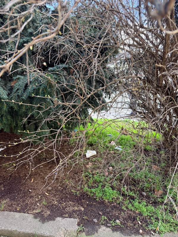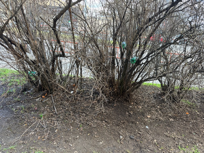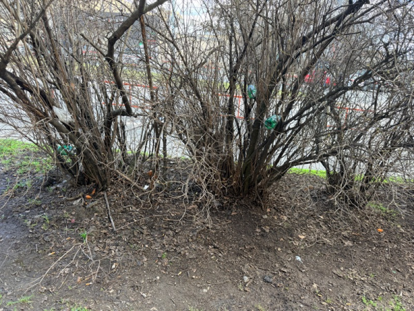 Odpadky v zeleni mži domem Voticka 1 a 3 a zastávkou autobusu