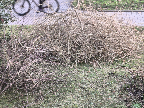 Hromada větví na trávníku k odvozu.