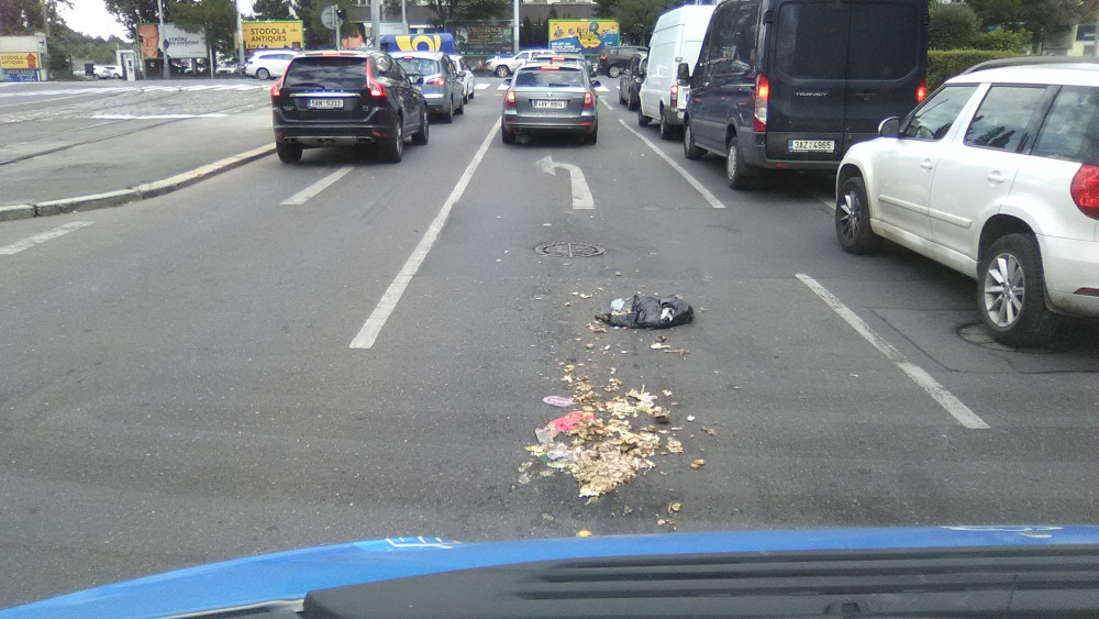 Pytel odpadků rozjetý u křižovatky v silnici.