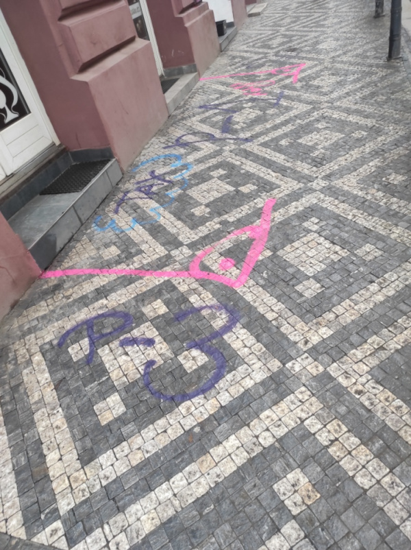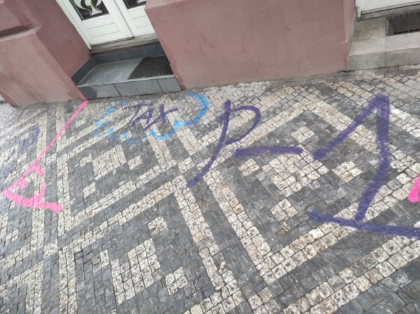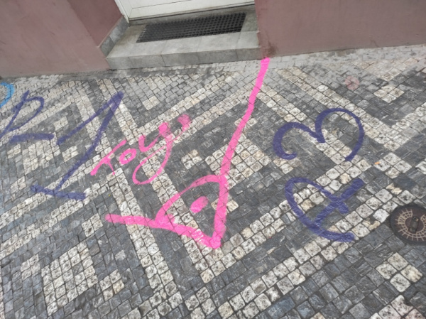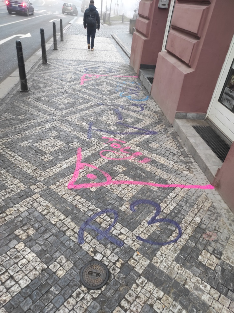 Posprejovaný chodník před domem Husitská 106/1, Praha 3 - Žižkov. Večer ve čtvrtek 26.2. nahlášeno na MOP Policie ČR Žižkov.