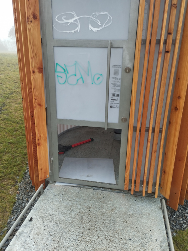rozbité dveře u nového záchoda na Parukarce - naproti dětskému hřišti