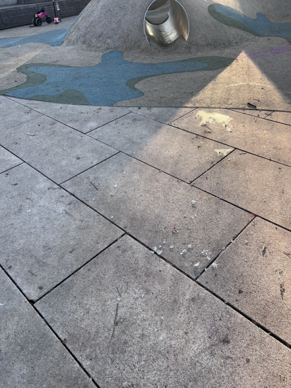 Rozbité sklo a střepy po celém hřišti.