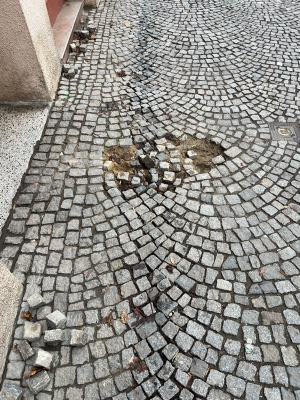 Zničený chodník hned u vstupu do domu Roháčova 92 Žižkov, nevím kam jinam mám nahlásit, změňte.to nemělo efekt
