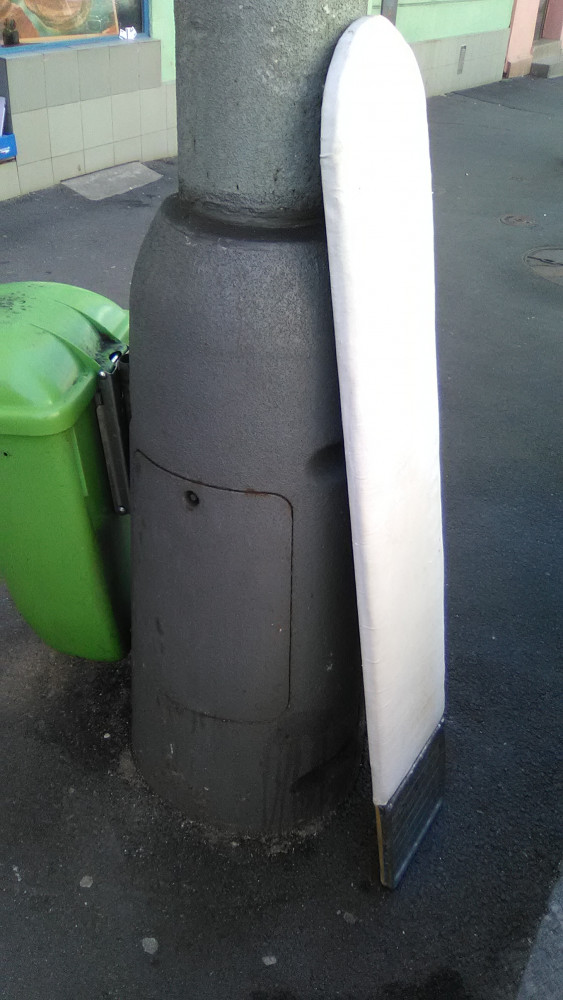 Žehlicí prkno opřené o lampu.