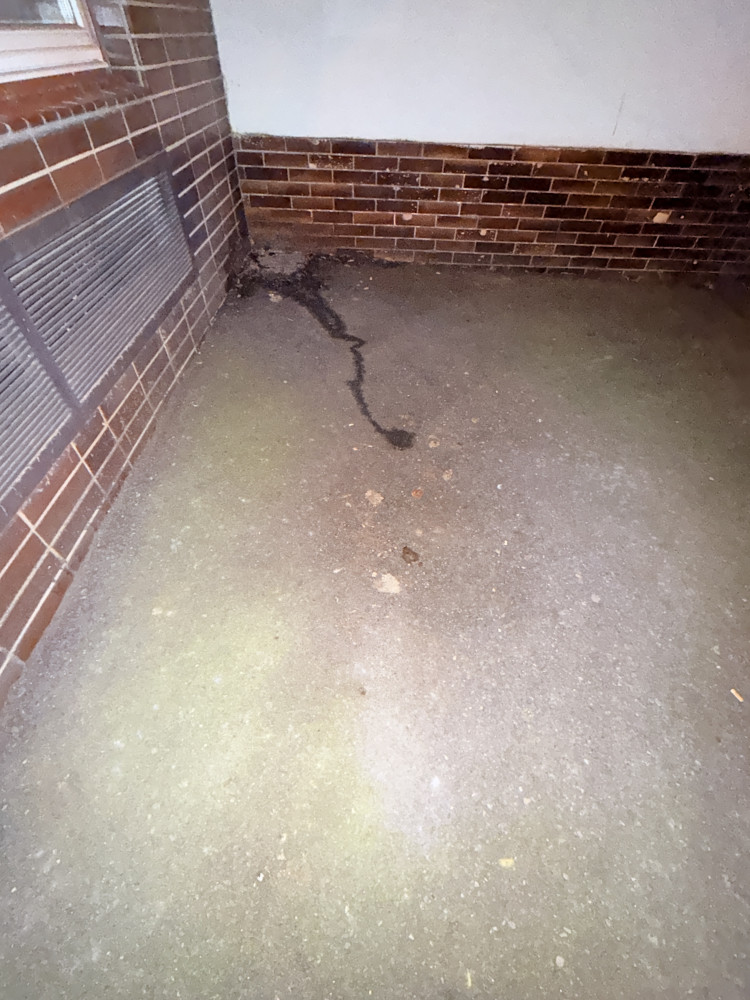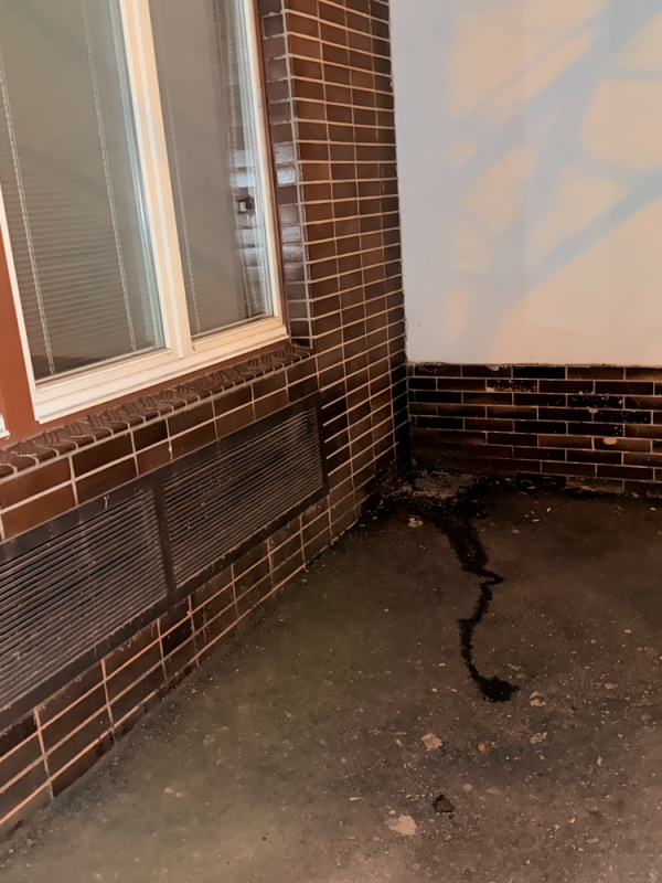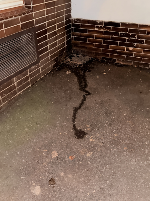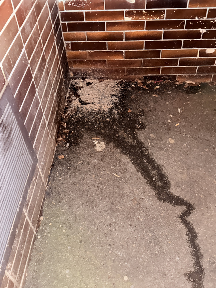 Zvratky a moč v rohu mezi domy Lucemburská č. or. 8 a 10, přímo pod okny bytové jednotky v přízemí + psi exkrementy.