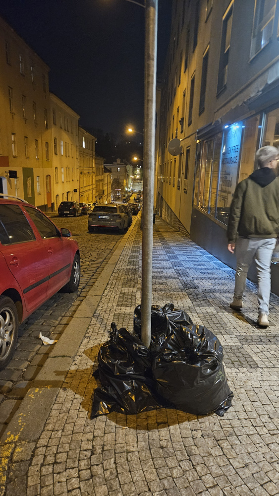 děkujeme za Váš podnět. Pytle jsou nejspíš některé úklidové služby (naše pytle jsou červené) nebo údržby zeleně, které provádí jejich svoz na konci dne. V případě, že znáte původce odpadu, děkujeme za doplnění podnětu.