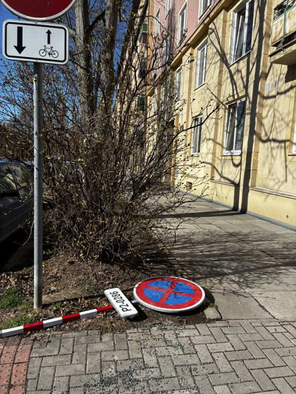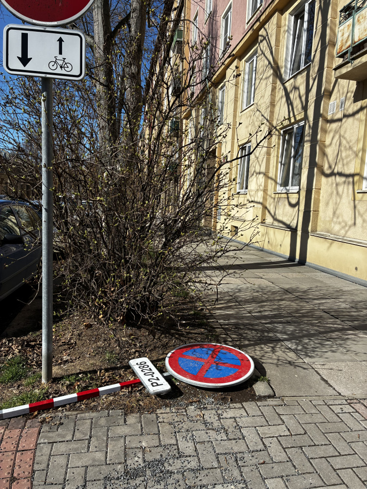 Biskupcova 61, roh ulice, leží dopravní značka. Již několik týdnů.