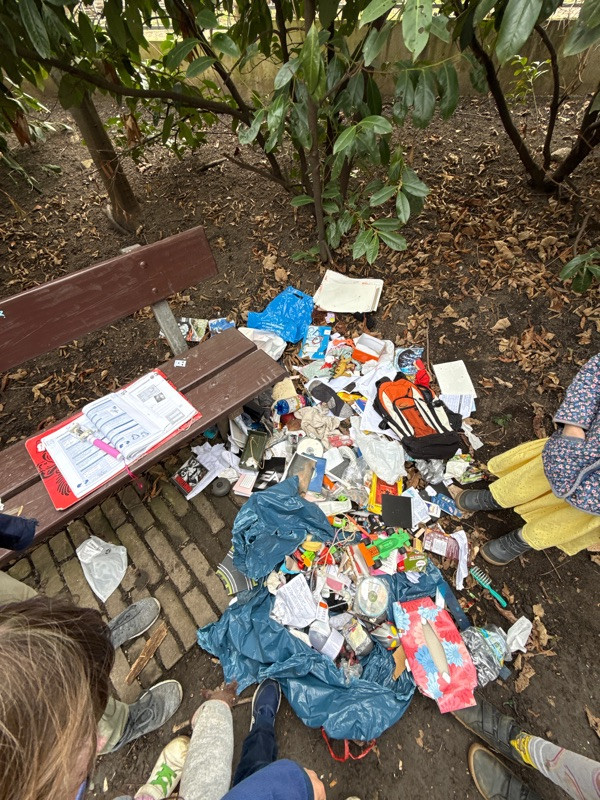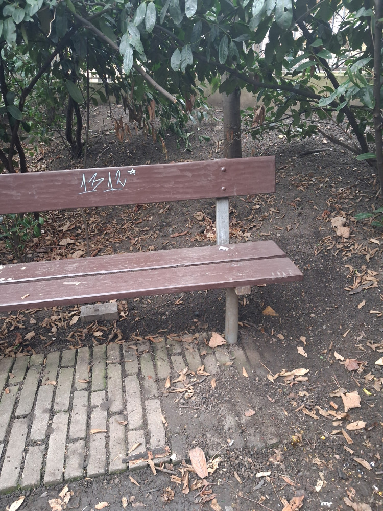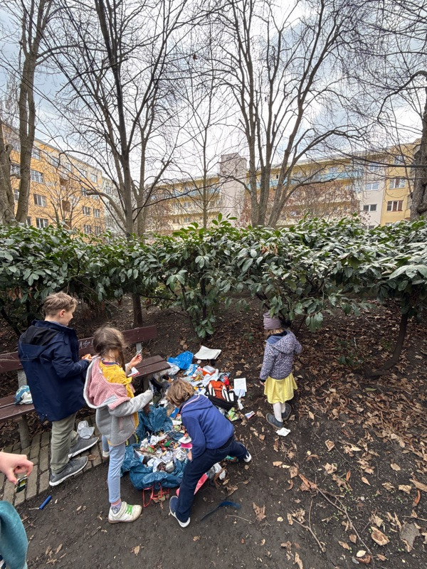 Nepořádek ve veřejném vnitrobloku Soběslavská. V zadní části u lavičky mezi keři.
