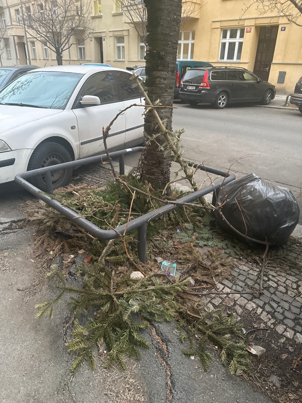 Vanocni stromecky u stromu a pytel s odpadem