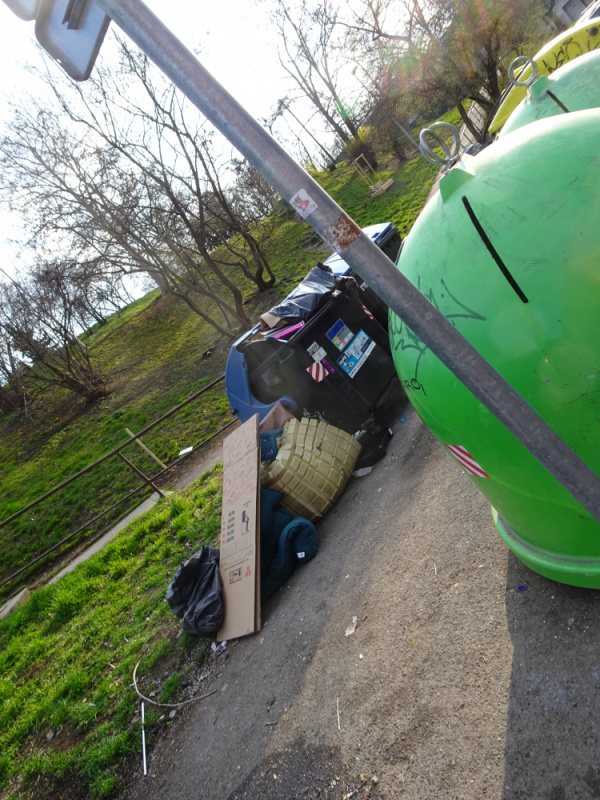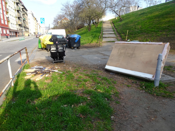 v ulici Jeseniova u kontejenru na trideny odpad je vyhozena postel a stary dvojkocarek.