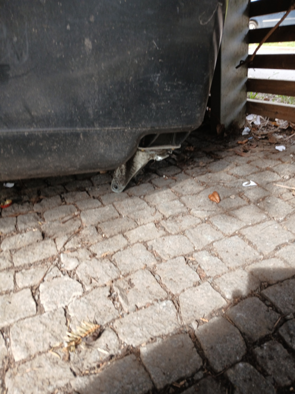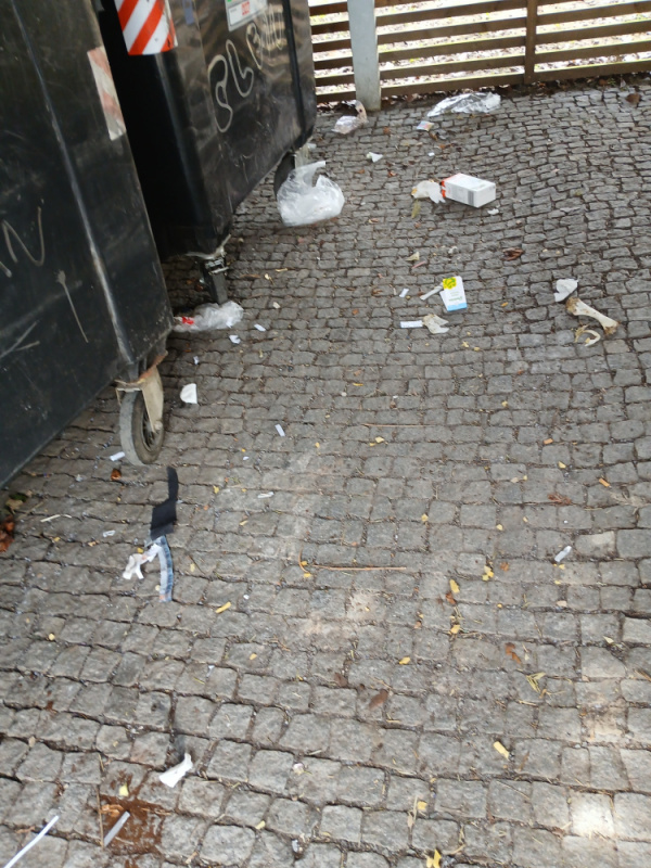nepořádek a rozbité kolečko u kontejneru na papír