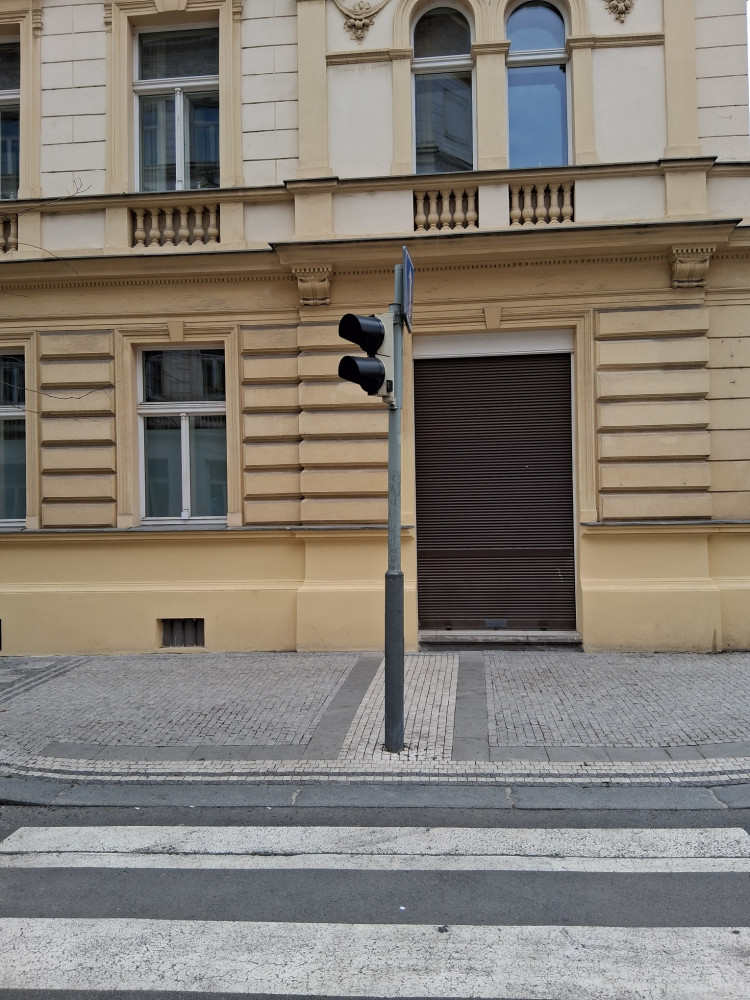 pootočený semafor u přechodu pro chodce, Peunova x Slezská, Praha 3