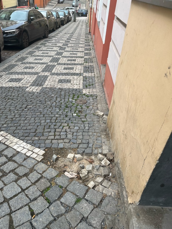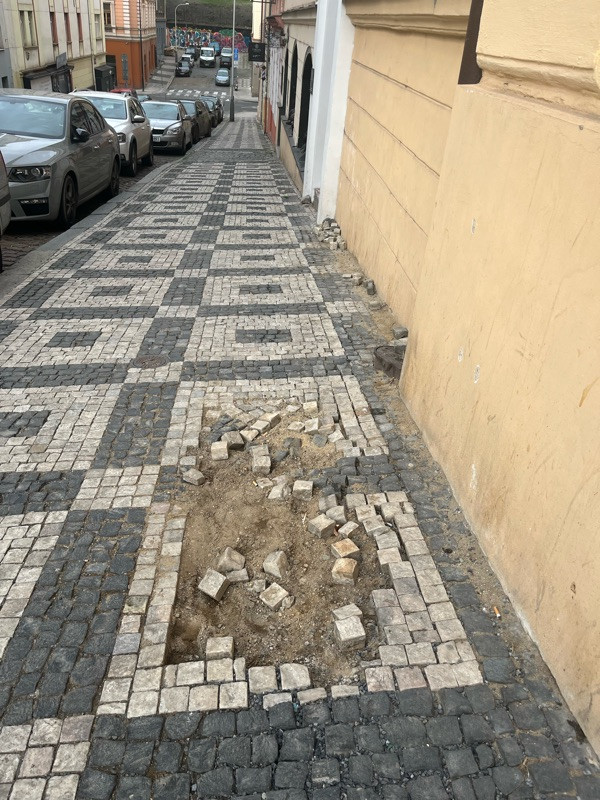 V Jeronýmově ulici, Praha 3, především u domu číslo 2, 4 a 6 je poškozené dláždění chodníku.