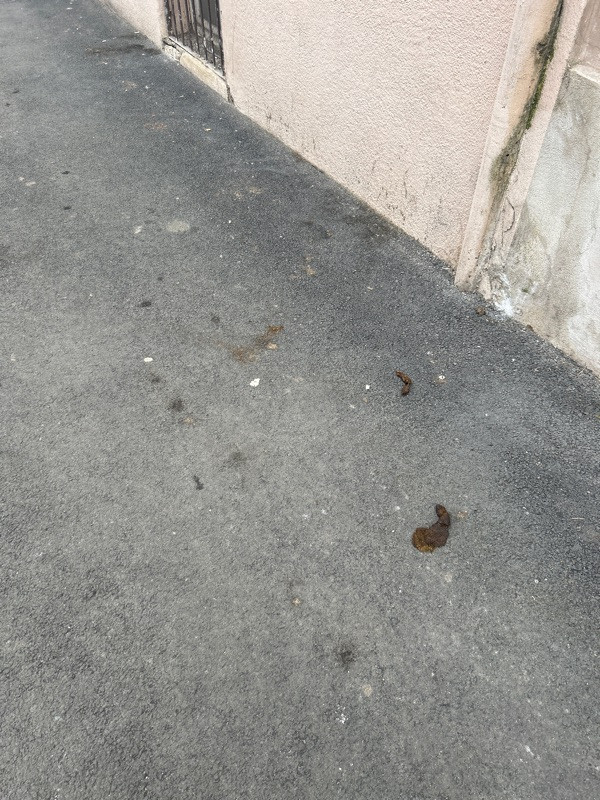 Exkrement na chodníku. Řehořova 24 a 26