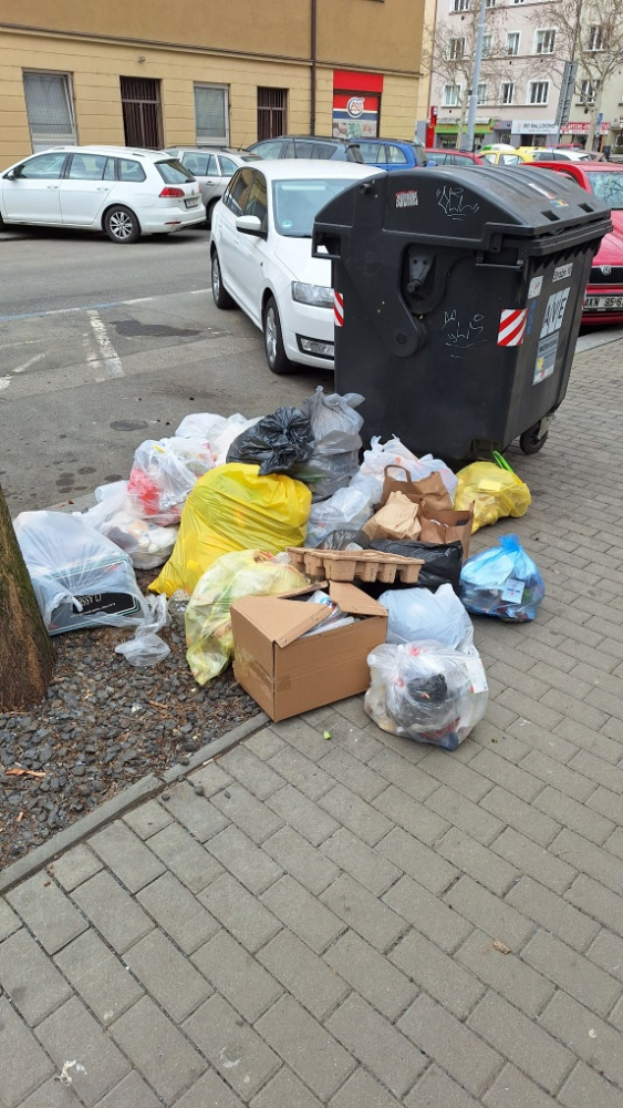 Přebytek odpadků z popelnice se válí na ulici