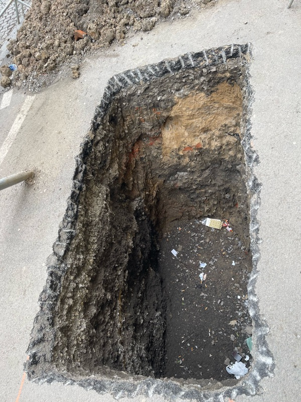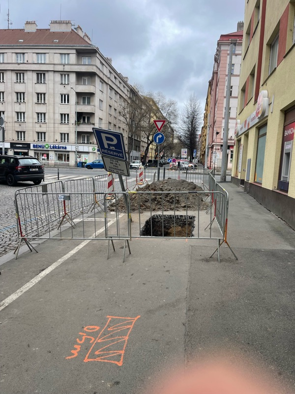 V Biskupcove ul od c 6 ke krizovatce s Zelivskeho ulici je od 26.3.2026 v chodniku vykop a mnozstvi zeminy podstatne omezuje rozsah chodniku s pritom cely tyden na tomto miste neprobiha zadna cinnost. Vykop a hromada vykopku je sice ohranicena, ale zadne pisemne ci jine oznaceni ci udentifikace zde neni.