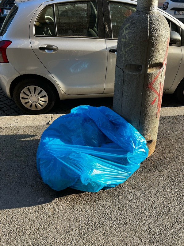 velky pytel s odpadem pred domem Slezska 79, je tam opakovane