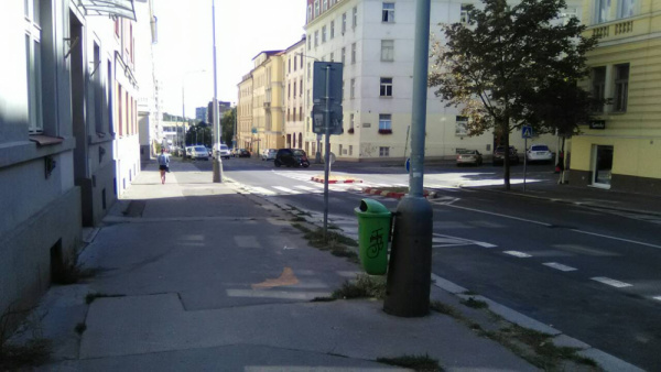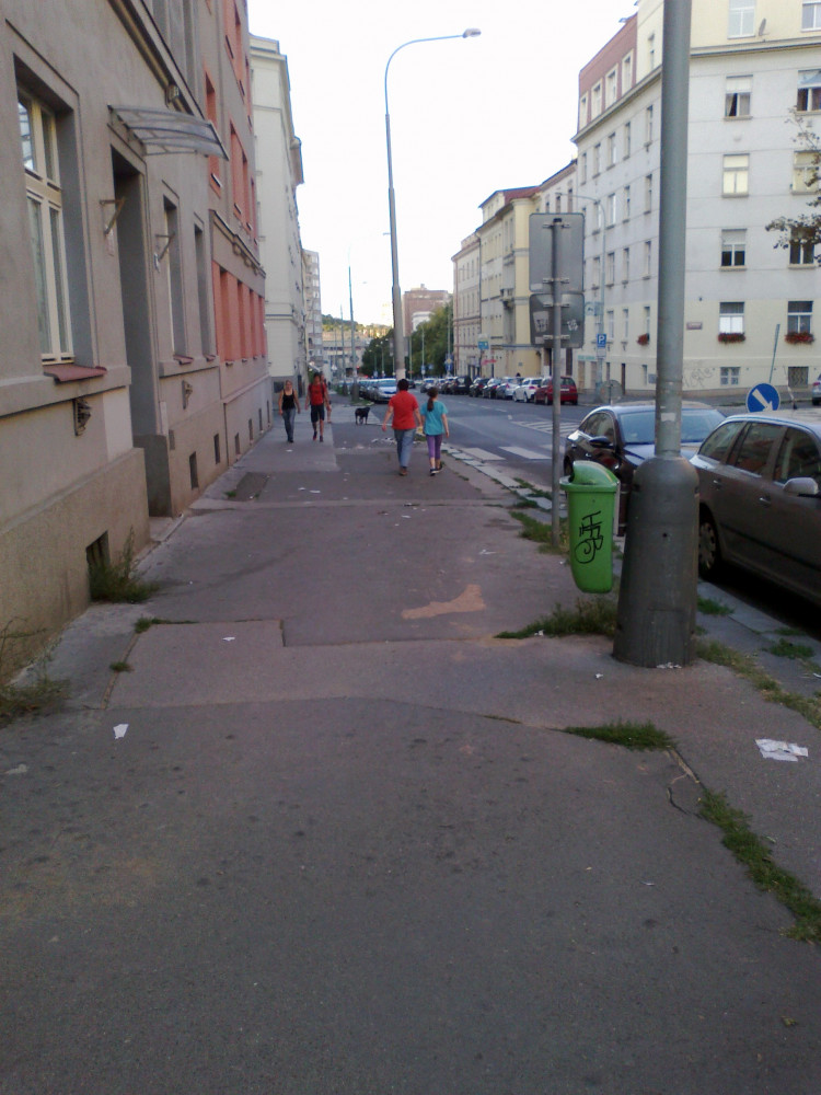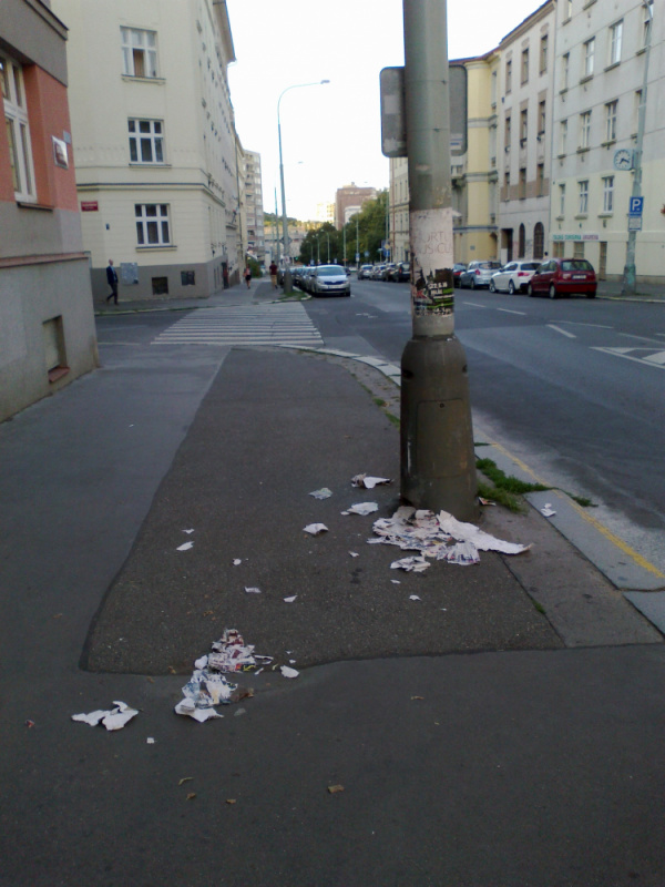 Strhnuté plakáty, zbytky papíru po celém chodníku: Ondříčkova před odbočkou do Čajkovského.