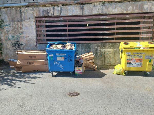 asi nějaká firma dává velké papírové kra ice vedle kontejneru