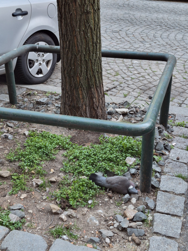 mrtvý holub pod stromem přímo před vchodem č.p. 1521