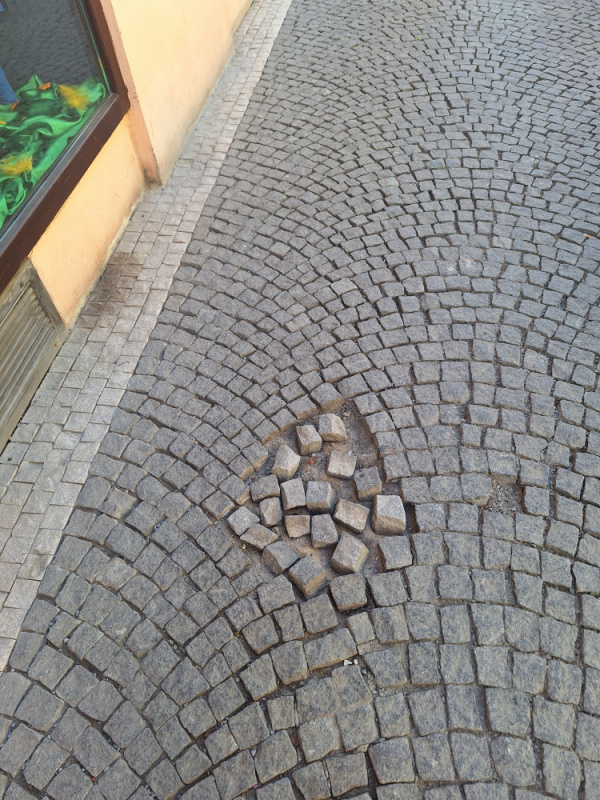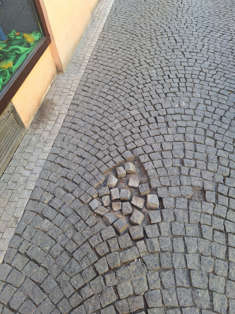 Díra v chodníku. Prosím o opravu. Moc děkuji.