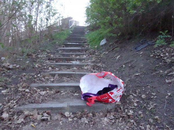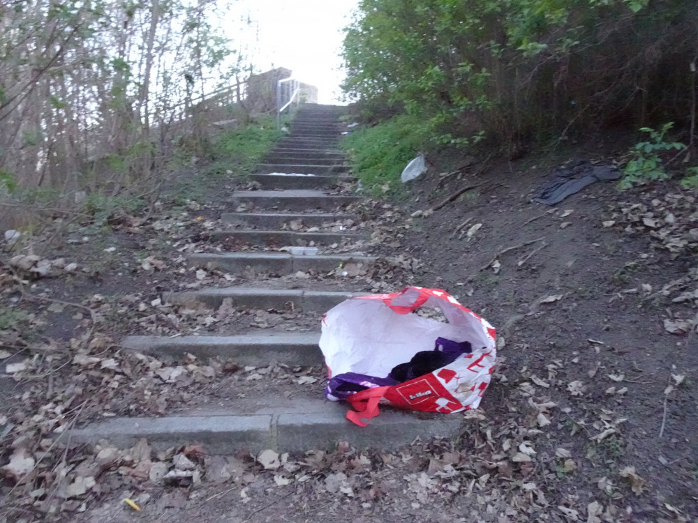 v ulici k Cervemu dvoru na schodech je vyhozena taska s oblecenim. prosim o uklid.