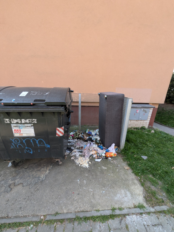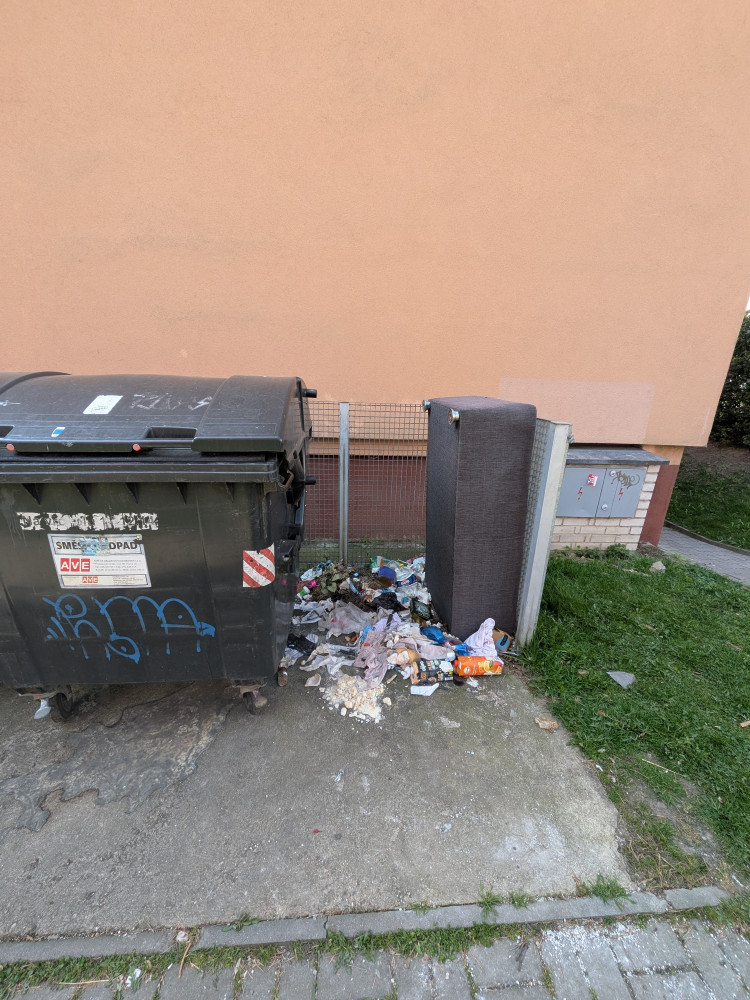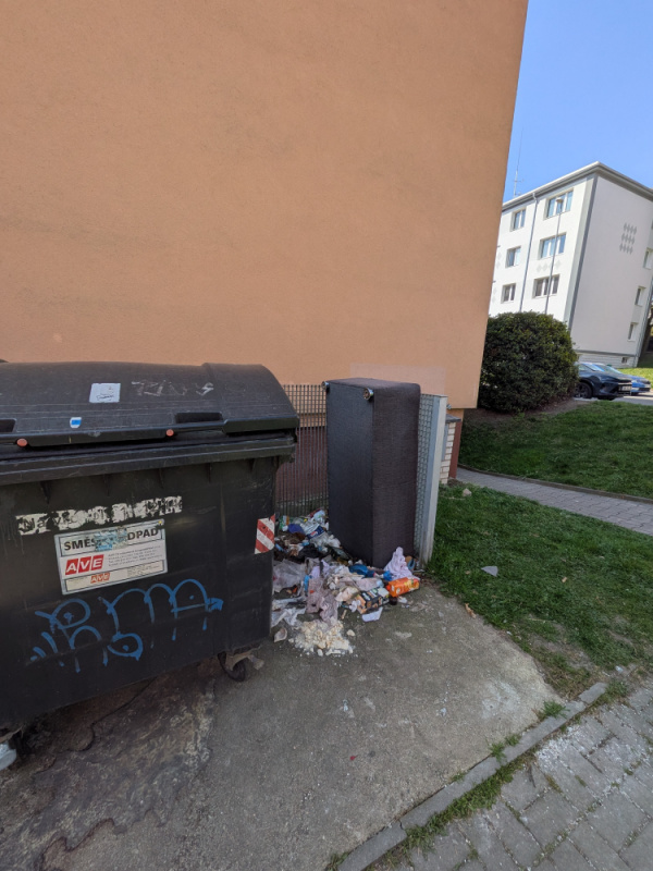nepořádek na zemi u kontejneru po bezdomovcích