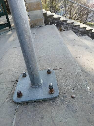 Vytržený kotvící šroub od zábradlí v Rajské zahradě. Protáčí se.