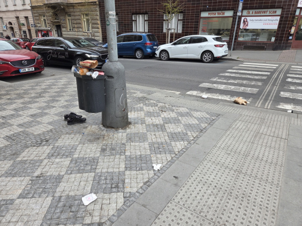 opakovane preplneny odpadni kos, a jelikoz je to na rohu Milesovske a namesti, fouka tam a vitr to rozfoukava. Takrwz je to u informacniho centra P3, tak o vic je to ostudne.