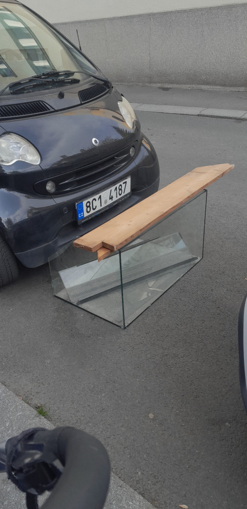 Obrovské rozbité akvárium někdo pohodil mezi parkující vozy v ústí ulice V Horní Stromce.