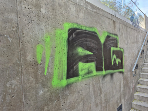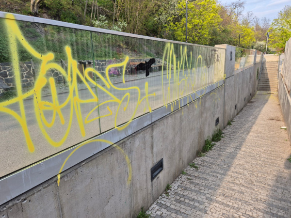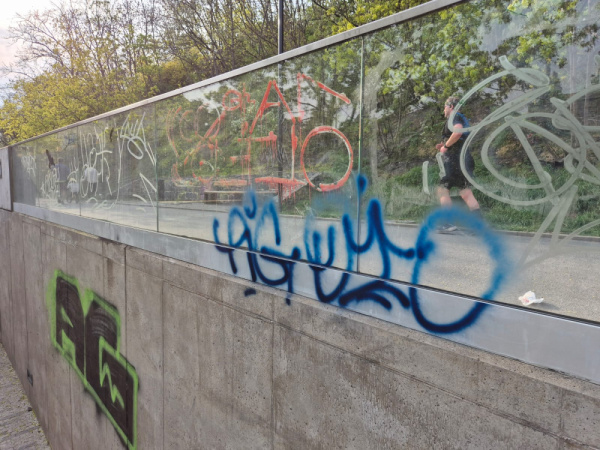 Graffiti u vstupu na cyklostezku v ulici Pod Vítkovem.